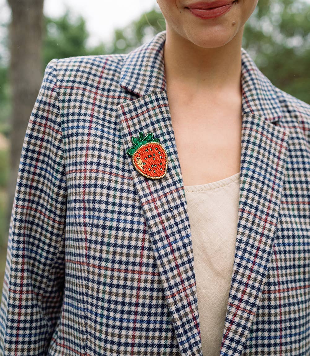The Bala Mani Beaded Strawberry Brooch Pin is handcrafted by artisan makers in India, who use colorful beads, thread, and sequins to create cute motif brooches. Wear or gift a single pin of a favorite motif or together with other pins to show off a unique sense of style!