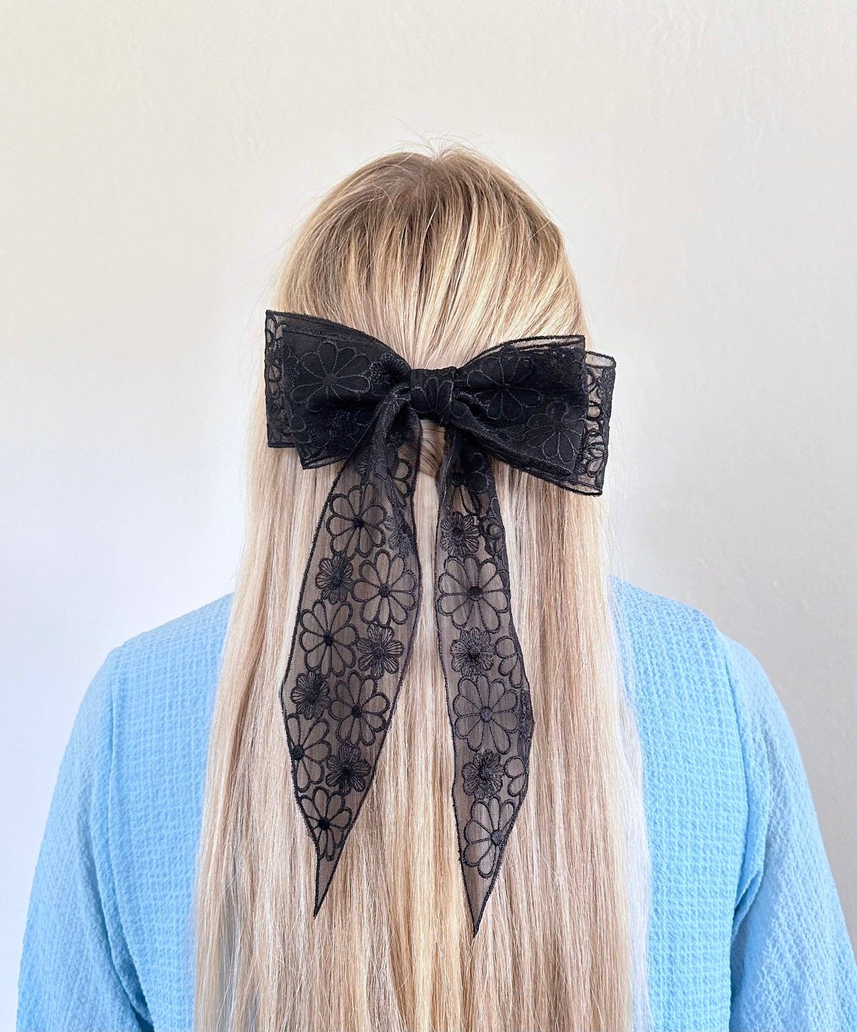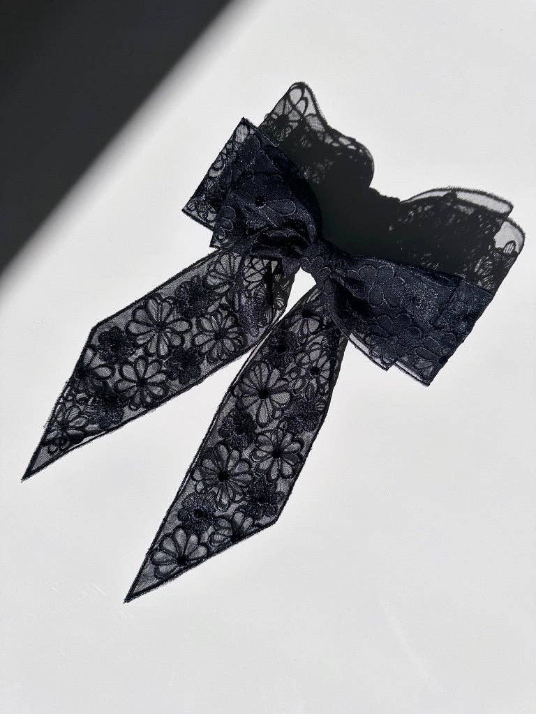 - premium floral daisy lace - hand-knotted bow - french barrette clip - Imported