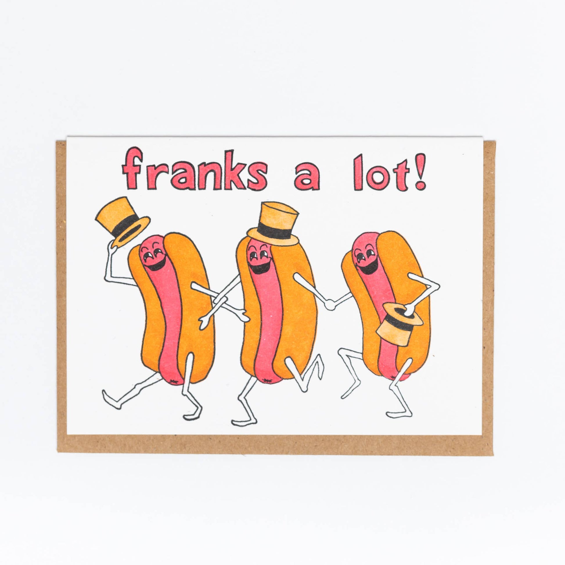 What says thank you better than dancing hot dogs? Not anything I can think of! Hand drawn by the talented Krystan Bruce.
