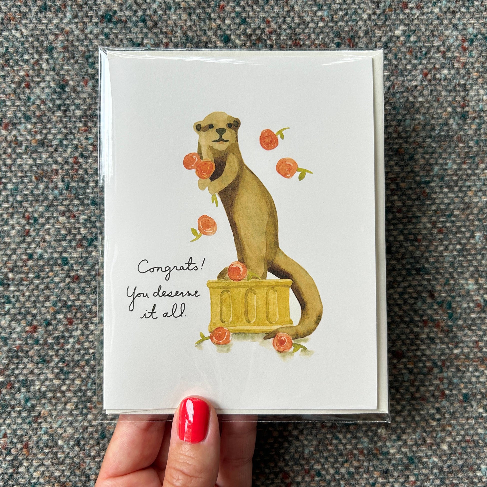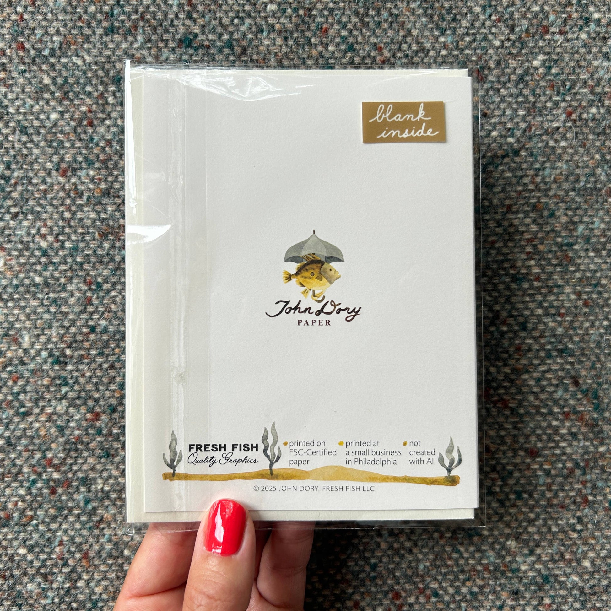 John Dory greeting cards were created to be honest, vulnerable and authentic – with simple messages that are from the heart, and original watercolor artwork that was created by hand. These sturdy cards measure 4.25" x 5.5" (A2 size), and are packaged individually in a clear sleeve with an ivory envelope. They are printed on FSC-Certified, 100# smooth, matte cover paper at a small print shop in Philadelphia. Blank inside. The envelopes are sourced from Michigan's family-owned French Paper Company. For the greeting card category of Congratulations, this card depicts an otter standing on a pedestal receiving roses with the phrase "Congrats! You deserve it all." John Dory Paper is a division of Fresh Fish Quality Graphics – a small, woman-owned design studio located in Audubon, New Jersey. We aim to create art that celebrates our unique place in the world and connects us to each other, featuring special interests and local lore.