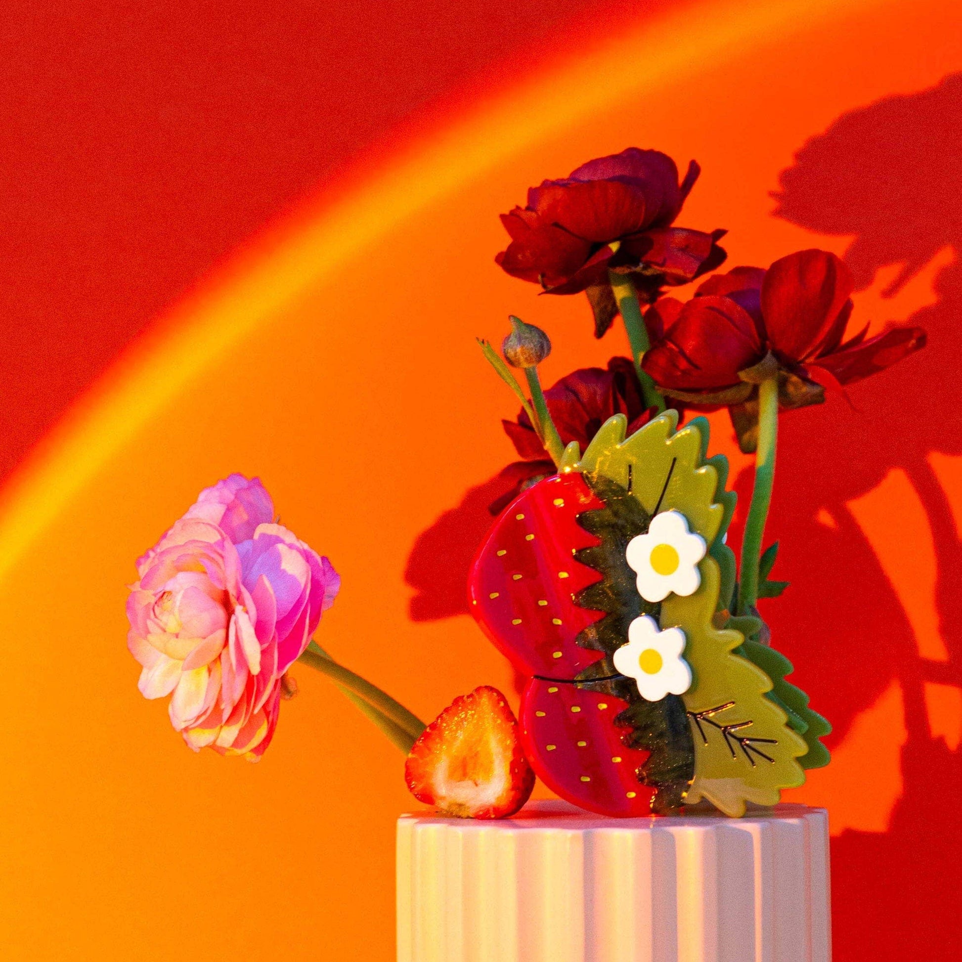 This charming red strawberry and flower hair claw is made of cellulose acetate––a plant-based alternative to plastic!