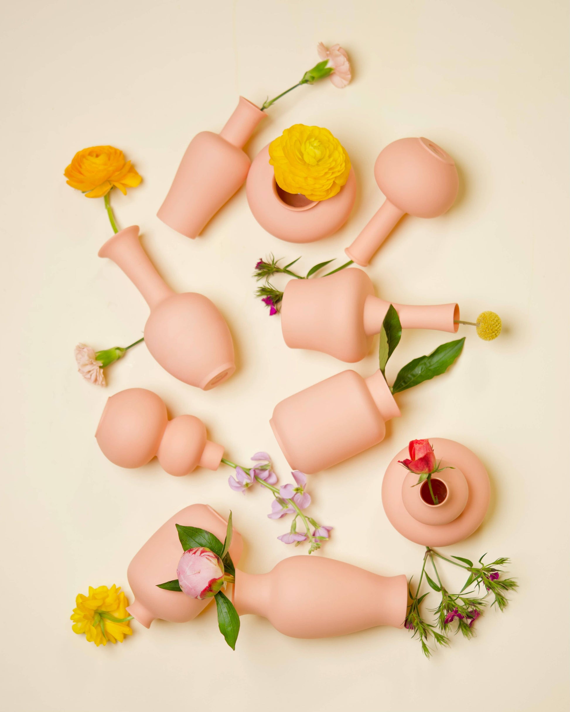 These mini vases are sure to impress. Their uniquely colored and made of clay porcelain with a matte finish and glazed interior. Fill your home with a pop of color and give your flowers a happy friend.