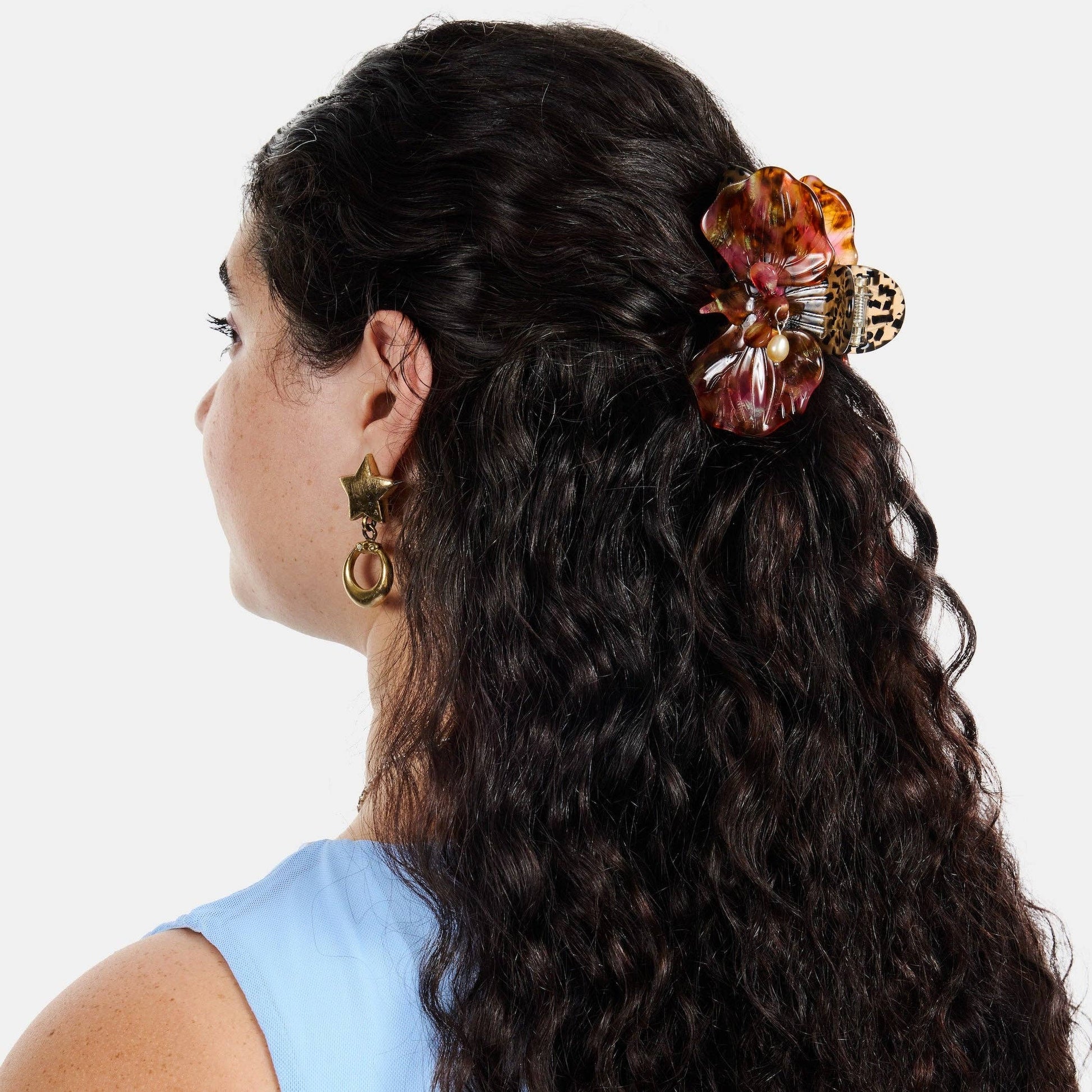 The Orchid Claw in Cougar transforms a simple hairstyle into something a little more striking. Inspired by the graceful shape of an orchid in bloom, layered petals and a delicate pearl accent create a sculptural accessory that feels both refined and playful. Whether you’re sweeping your hair up for a busy morning or adding a finishing touch before heading out, this clip brings effortless style to the moment.