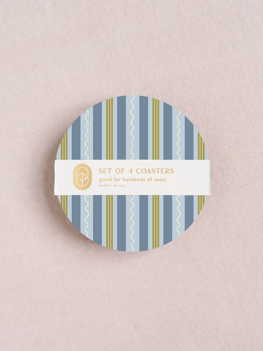 Set of four 60 pt chipboard coasters, measuring 3.7 inches. Made in the USA. Our coasters are comprised of wood pulp, made exclusively with shavings from sustainable forestry. They are printed with UV ink, and packaged with a foil-pressed belly band made of recycled cotton paper.