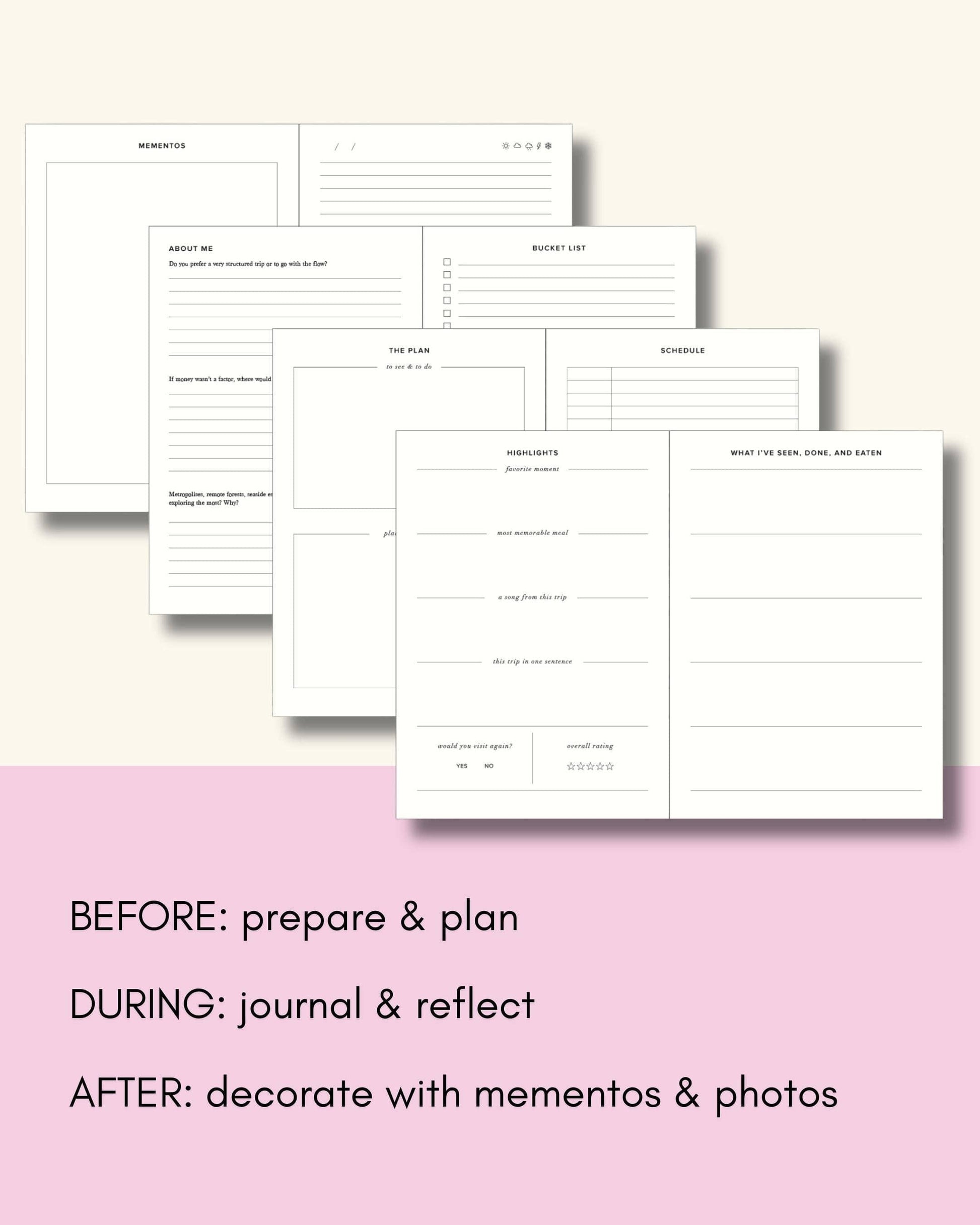 Designed to guide without limiting you, this journal blends thoughtful prompts with open blank pages, so you can plan ahead, reflect freely, and document your journey in a way that feels personal. With dedicated space for photos, notes, and memories, it helps turn each trip into a story you’ll want to revisit again and again.